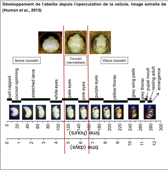 Dans le jeune couvain, l’objectif est de vérifier que le taux d’infestation est suffisant. En ajoutant 150 varroas, un taux d’infestation d’environ 10 % est recherché. Le stade du jeune couvain s’arrête aux nymphes aux yeux blancs. Ensuite, dès la présence de pigmentation dans les yeux de la nymphe, il s’agit du couvain intermédiaire. C’est durant cette étape que le comportement de résistance se déroule (Harris, 2007). Un varroa retrouvé à ce stade n’est pas comptabilisé car sa présence ne permet pas de tirer de conclusion sûre. La troisième catégorie commence dès que les yeux des nymphes deviennent pourpres, il s’agit du stade du vieux couvain. Ici, deux paramètres sont mesurés et utilisés pour déterminer le score de résistance de la colonie. Le premier est le taux d’infestation qui, dans une colonie résistante, doit connaître une baisse drastique dans le temps ou par rapport au jeune couvain. Le second est le taux de non-reproduction des varroas qui doit être supérieur à 50 % pour avoir une colonie hautement résistante.